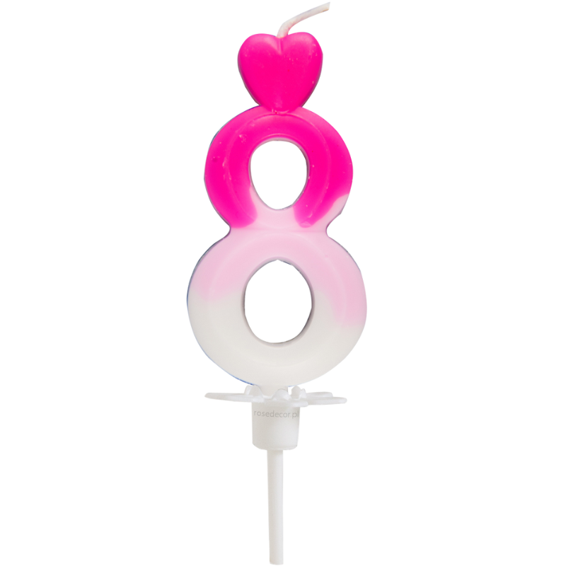 Seria dwukolorowych, cieniowanych świeczek na tort w kształcie cyfr. Doskonałe wykończenie tortu idealna na każdą okazję. Świeczki posiadają pasy w kolorze białym i różowym.