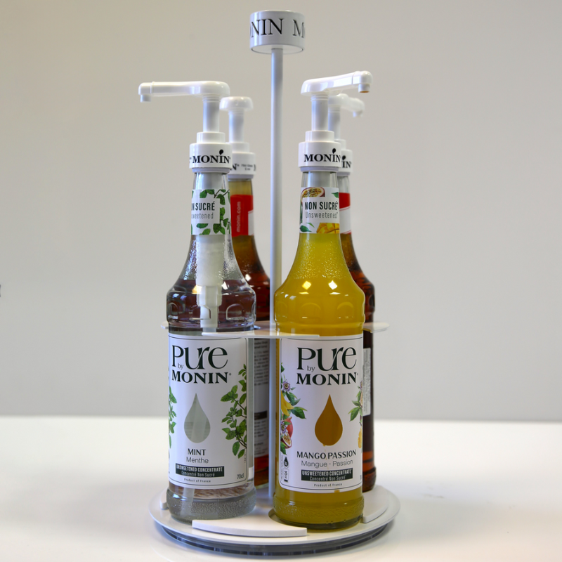 Bardzo praktyczny - obrotowy stojak do ekspozycji syropów marki Monin.