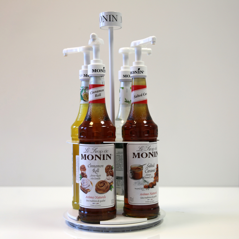 Bardzo praktyczny obrotowy stojak na 4 butelki syropów. Niezbędny element wyposażenia każdego baru i kawiarni. Stabilna metalowa konstrukcja i elegancki biały kolor.