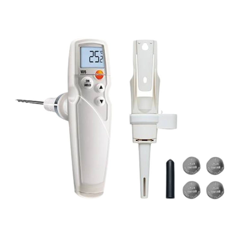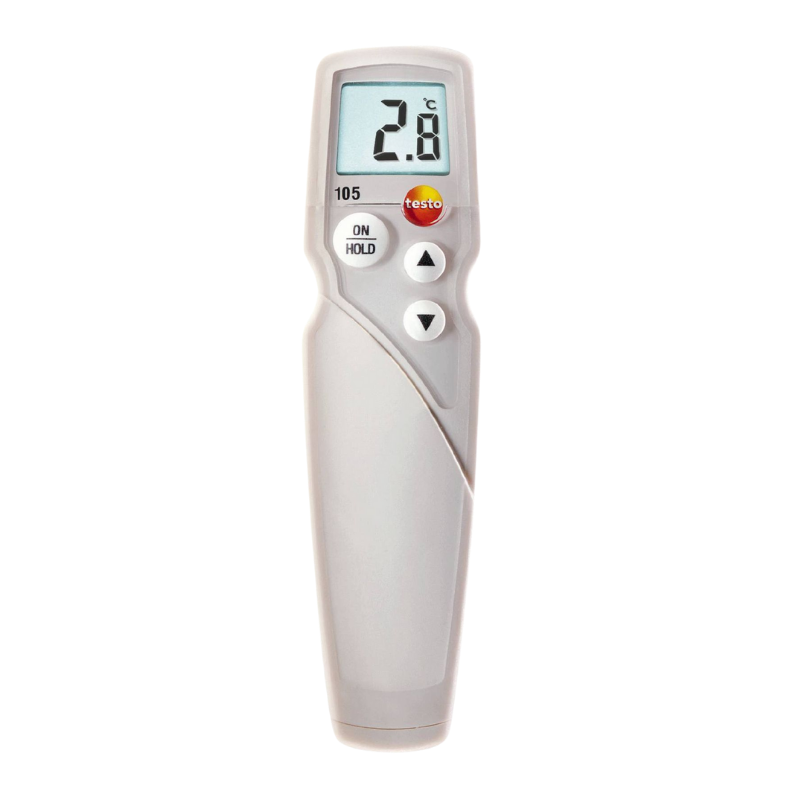 TESTO 105 - wodoodporny termometr o mocnej konstrukcji z sondą, umożliwiający precyzyjny pomiar temperatury wewnątrz produktów głęboko mrożonych. Został zaprojektowany specjalnie dla przemysłu spożywczego, umożliwia prowadzenie procesu kontroli żywności, a tym samym zapewnienie jej bezpieczeństwa do spożycia. Posiada ergonomiczny kształt, duży podświetlany wyświetlacz gwarantuje czytelność danych pomiarowych (nawet przy słabym oświetleniu). Wymienne sondy temperatury można w łatwy i szybki sposób załączyć do termometru. Możliwe do zastosowania wymienne końcówki pomiarowe to: standardowa sonda temperatury, długa sonda temperatury lub sonda temperatury do mrożonej żywności (końcówki wymienne nie znajdują się w zestawie, są to możliwości do zastosowania w urządzeniu pomiarowym). Termometr sygnalizuje o przekroczeniu wartości granicznych temperatury za pomocą alarmu dźwiękowego lub optycznego. Termometr posiada również w zestawie futerał z paskiem oraz uchwytem ściennym. Dodatkowo dzięki klasie wodoodporności (IP65) może być myty pod bieżącą wodą. Urządzenie spełnia normy HACCP oraz jest certyfikowany zgodnie z NORMĄ ISO 13485.