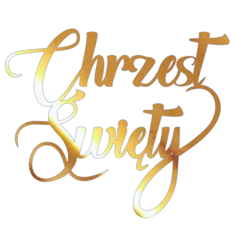 Złota dekoracja na tort w kształcie napisu "Chrzest Święty". Prosty sposób na efektowną dekorację tortu na chrzciny. Artykuł dekoracyjny przeznaczony do kontaktu z żywnością.