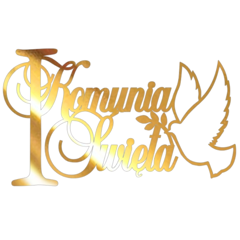 Akrylowa dekoracja na tort! Złoty topper z napisem "Komunia Święta". Prosty sposób na efektowną dekorację tortu dla dziecka. Artykuł dekoracyjny przeznaczony do kontaktu z żywnością.