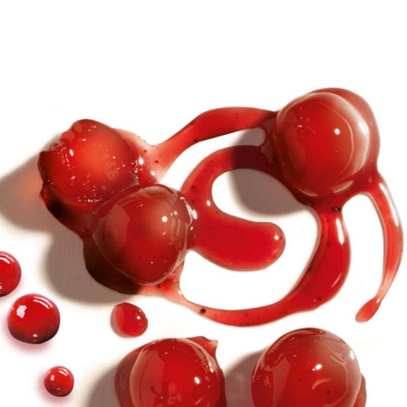 Składniki: cukier, syrop glukozowy, zagęszczony sok wiśniowy (23%), woda, regulator kwasowości: kwas cytrynowy (E330), aromaty, substancje zagęszczające: agar agar (E406), pektyna (E440), barwniki: karmel amoniakalny (E150c), antocyjany (E163), ekstrakt ze spiruliny; produkt może zawierać soję, mleko, jaja, migdały, orzechy laskowe, orzechy włoskie, pistacje.