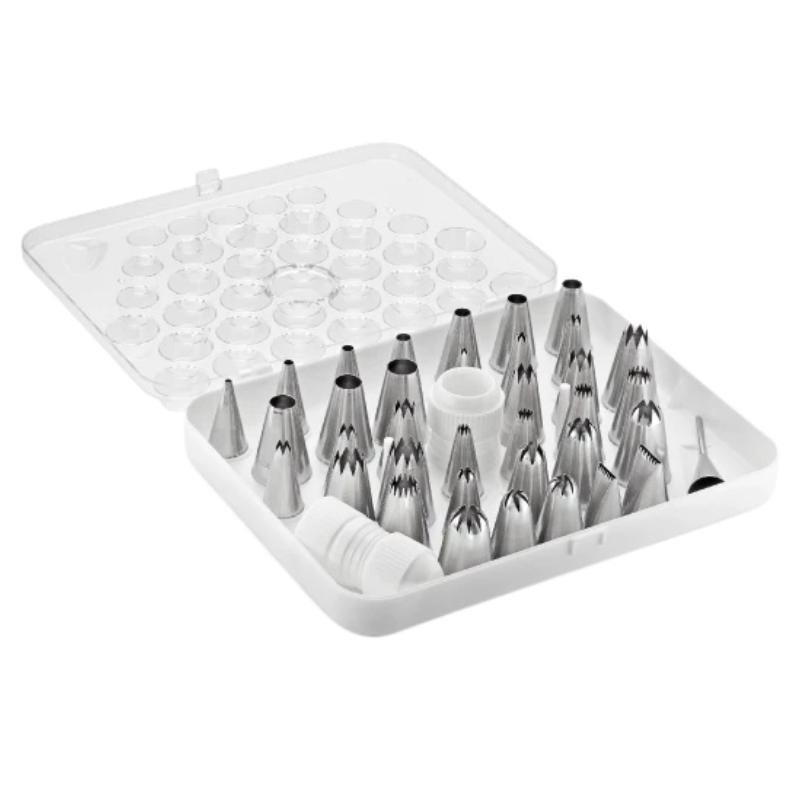 Opis: zestaw 36 końcówek wykonanych ze stali nierdzewnej do dekoracji cukierniczych oraz dwóch adapterów z tworzywa sztucznego;