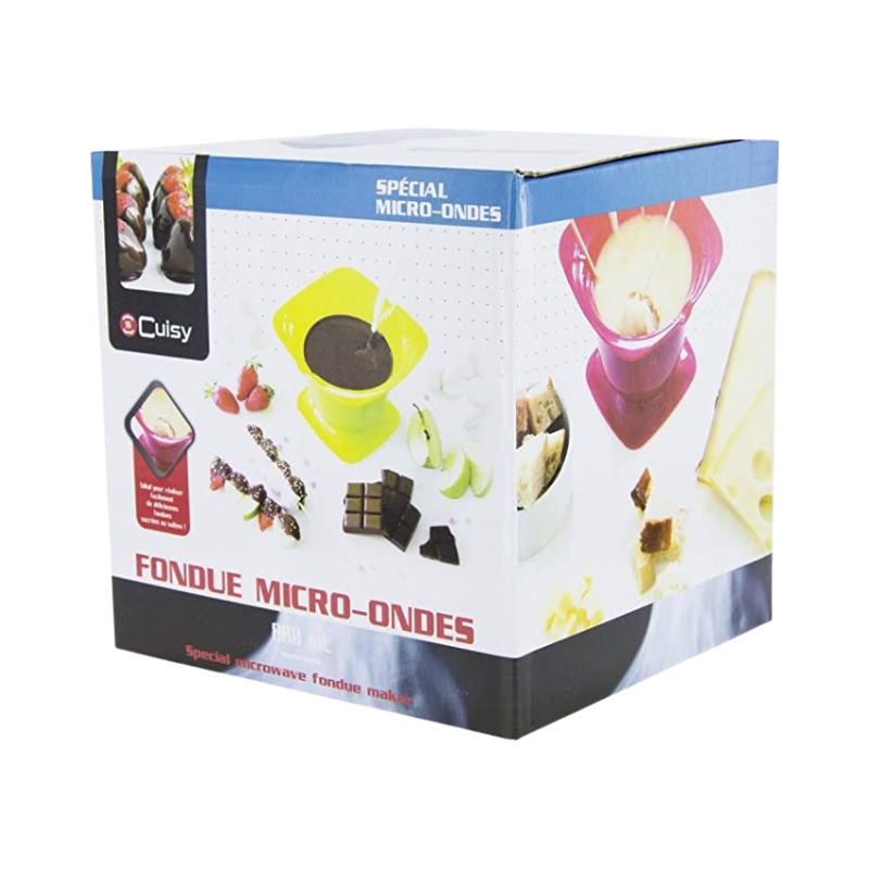 FONDUE MICRO-ONDES - to zestaw do przeznaczony do sprawnego przygotowania fondue w zaciszu domowym. W skład zestawu wchodzi specjalny pojemnik do fondue z pokrywką zapobiegającą rozpryskiwaniu, wyprofilowana łyżka do mieszania fondue oraz 12 drewnianych patyczków (do maczania). Pojemnik do fondue wykonany został z odpornego tworzywa przeznaczonego do użytkowania w kuchence mikrofalowej. Ergonomiczny kształt pojemnika zapewnia łatwe przenoszenie, wyjmowanie z kuchenki mikrofalowej oraz stabilność podczas serwowania. Wygodna pokrywka z uchwytem zabezpiecza rozpryskiwaniu się podgrzewanej masy, a tym samym nie powoduje zabrudzenia kuchenki mikrofalowej. Wyprofilowana łyżka pozwala na dokładne wymieszanie podgrzewanej masy, co zapewnia równomierny stopień upłynnienia. Drewniane patyczki przeznaczone są do maczania przygotowanych wcześniej dodatków w fondue. Zestaw doskonale sprawdzi się zarówno do klasycznego fondue czekoladowego jak i wytrawnych wersji.