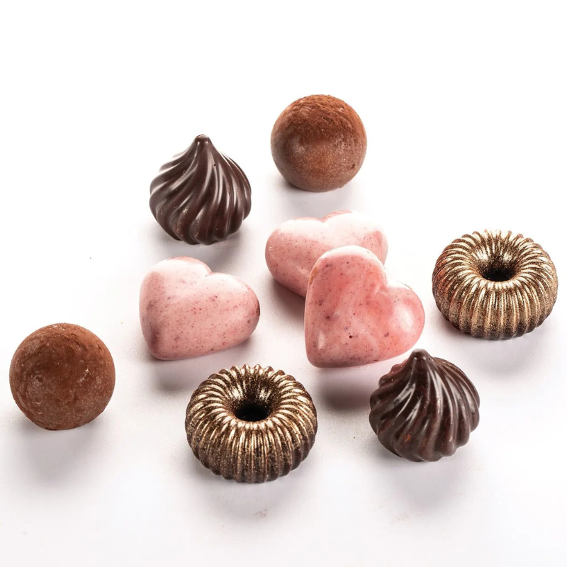 Easy Choc Chocolate Moulds, to wyjątkowa seria form silikonowych przeznaczonych do pracy z czekoladą. Seria została stworzona dla domatorów i miłośników czekolady. Pozwala na przygotowywanie wyjątkowych pralin i czekoladek w zaciszu domowej kuchni. W serii znajdują się różnorodne kształty, klasyczne, okolicznościowe i nowoczesne. Domowe czekoladki doskonale sprawdzą się na różnego rodzaju przyjęciach i uroczystościach lub jako słodki i spersonalizowany upominek dla najbliższych. Formy zostały wykonane z najwyższej jakości płynnego silikonu platynowego, który charakteryzuje się znaczną elastycznością oraz stabilnością termiczną, zapewniając wygodę podczas pracy. Formy przeznaczone są przede wszystkim do pracy z czekoladą, jednak wykazują odporność na działanie temperatur w zakresie od (-) 60°C do (+) 230°C, co daje możliwość pieczenia i mrożenia w formach. Doskonale sprawdzą się do domowych cukierków i żelków, drobnych ciasteczek lub tworzenia "kostek lodu". Dodatkowo form można bezpiecznie używać w kuchence mikrofalowej oraz myć w zmywarce. Podczas tworzenia domowych pralin formy najlepiej napełniać odpowiednio zatemperowaną czekoladą.