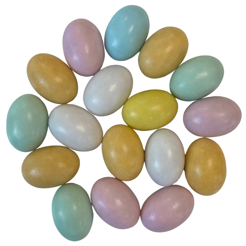 Jajka czekoladowe z chrupiącą powłoką w pastelowych barwach. Idealne do dekoracji wielkanocnych wypieków i deserów oraz jako słodka przekąska na świątecznym stole.