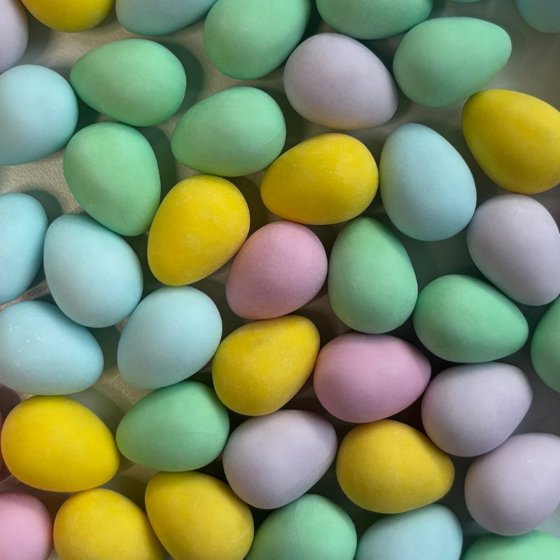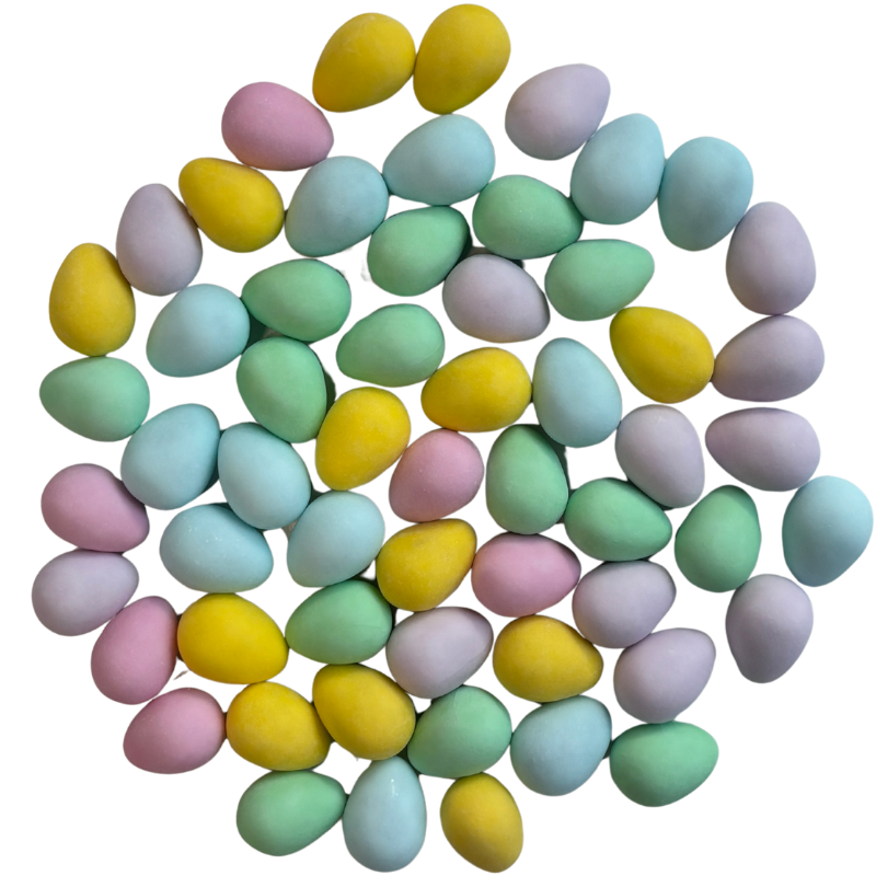 Czekoladowe jajeczka z chrupiącą powłoką w pastelowych barwach. Idealne do dekoracji wielkanocnych wypieków i deserów oraz jako słodka przekąska na świątecznym stole.