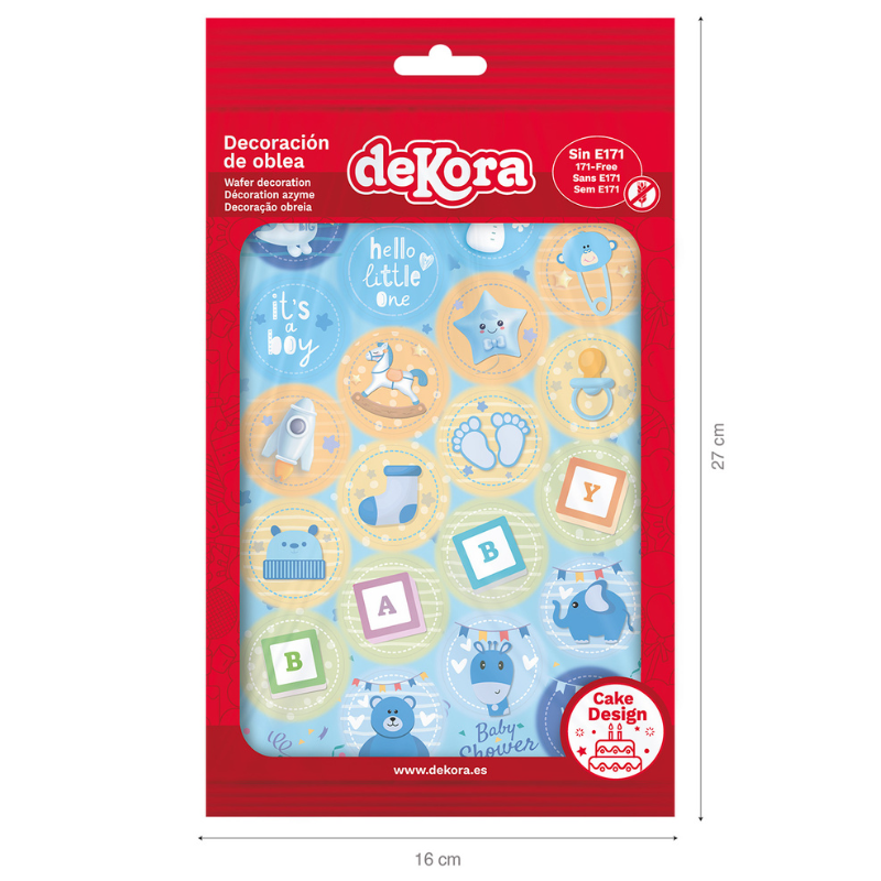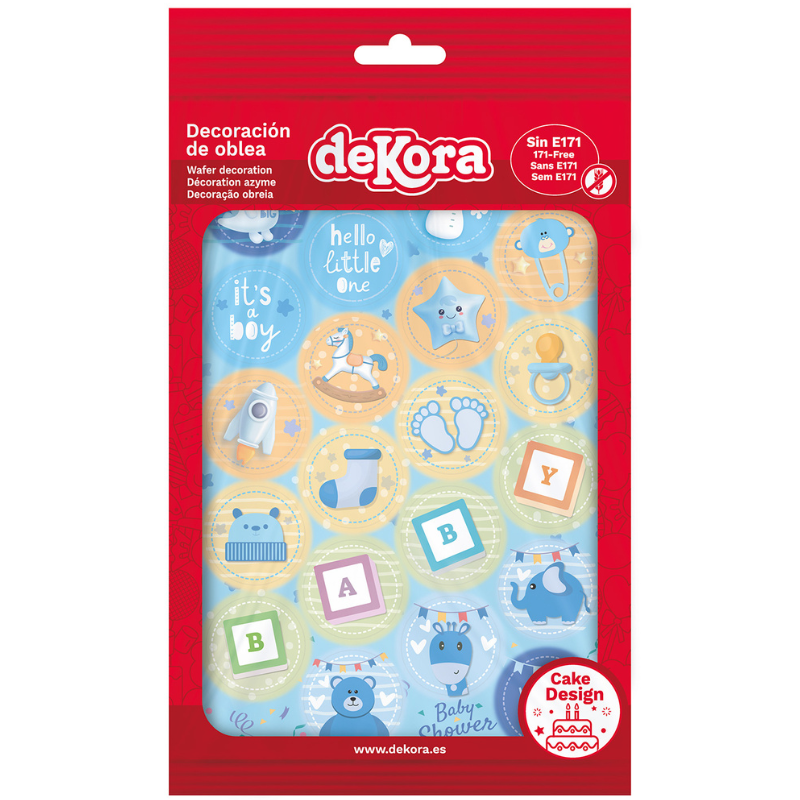 Idealnym rozwiązaniem będą kolorowe dekoracje waflowe, które zapewnią wyjątkowy efekt przy minimalnym nakładzie pracy. Małe okrągłe opłatki waflowe do dekorowania domowych babeczek i ciasteczek na Baby Shower. Doskonale sprawdzą się do dekoracji małych wypieków i deserów z kremami (babeczek, ciasteczek, lodów i wielu innych). Zaleca się dekorowanie słodkich wyrobów na maksymalnie 30 minut przed ich podaniem - zbyt długi kontakt papieru waflowego z masą może doprowadzić do rozmięknięcia papieru, a tym samym zniszczenia dekoracji. Nadruk na wtykaczach jest jadalny (przygotowany za pomocą tuszów spożywczych) i całkowicie bezpieczny do spożycia. Wydruk nie wpływa na smak gotowych wyrobów.
