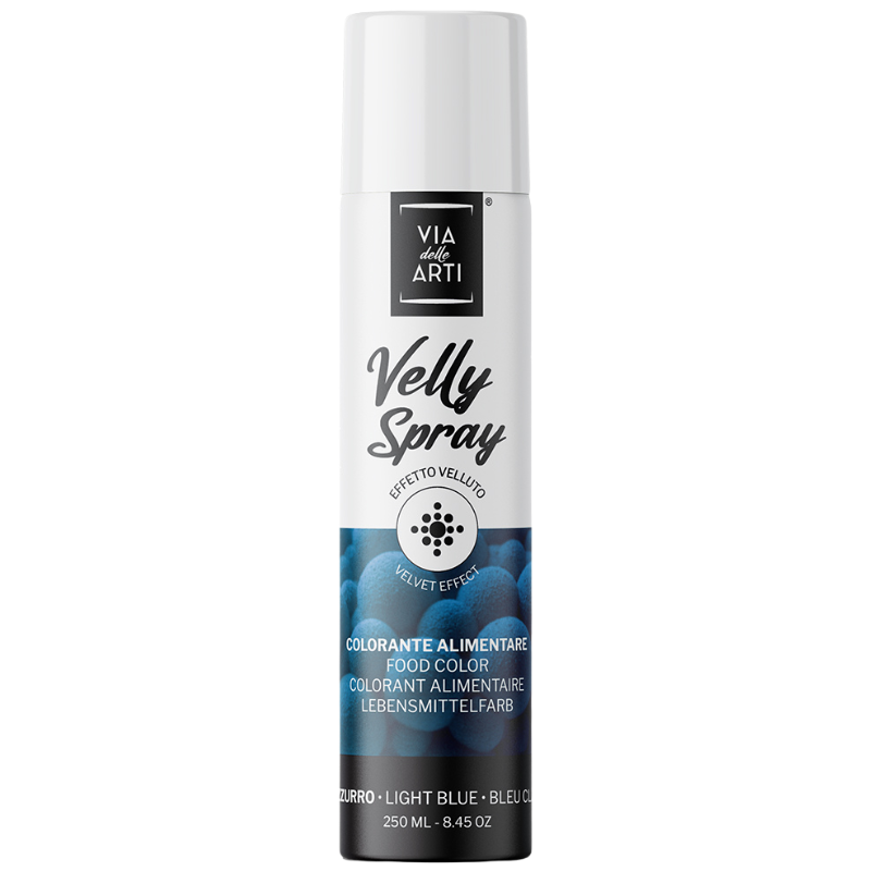 Colorante Velly Spray, to seria barwników w sprayu o strukturze zamszu. Barwniki przeznaczone są do dekorowania schłodzonej powierzchni różnorodnych wyrobów cukierniczych (między innymi kremów maślanych, masy cukrowej, marcepanu, wypieków, czekolady). Barwniki o strukturze zamszu należy nakładać wyłącznie na dokładnie schłodzony produkt (nanosić na zamrożoną - (-)10℃ - powierzchnię musu śmietankowego/kremu, lub na dobrze schłodzoną - (+)2℃ - powierzchnię czekolady, marcepanu czy masy cukrowej). Pozwalają one na uzyskanie strukturalnego i aksamitnego wykończenia dekorowanej powierzchni. Barwniki wytwarzane są na bazie tłuszczu kakaowego; nie zawierają w składzie bieli tytanowej (E171).