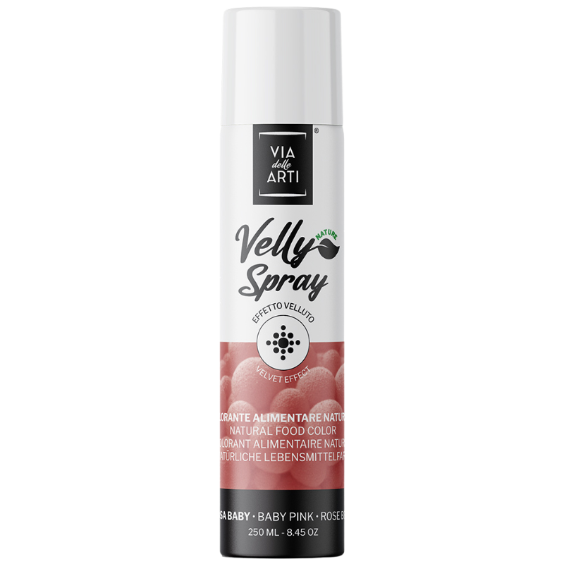 Colorante Velly Spray, to seria barwników w sprayu o strukturze zamszu. Barwniki przeznaczone są do dekorowania schłodzonej powierzchni różnorodnych wyrobów cukierniczych (między innymi kremów maślanych, masy cukrowej, marcepanu, wypieków, czekolady). Barwniki o strukturze zamszu należy nakładać wyłącznie na dokładnie schłodzony produkt (nanosić na zamrożoną - (-)10℃ - powierzchnię musu śmietankowego/kremu, lub na dobrze schłodzoną - (+)2℃ - powierzchnię czekolady, marcepanu czy masy cukrowej). Pozwalają one na uzyskanie strukturalnego i aksamitnego wykończenia dekorowanej powierzchni. Barwniki wytwarzane są na bazie tłuszczu kakaowego; nie zawierają w składzie bieli tytanowej (E171).