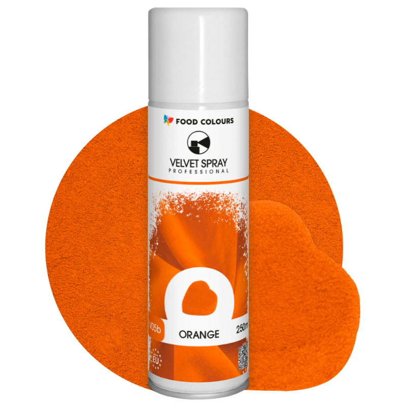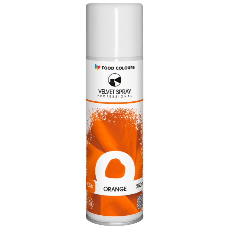 Velvet Spray Professional od Food Colours, to seria barwników spożywczych o strukturze zamszu przeznaczonych do dekorowania powierzchni wyrobów cukierniczych. Barwniki wytwarzane są na bazie tłuszczu kakaowego i umieszczane w pojemnikach pod ciśnieniem. Pozwalają na precyzyjne pokrywanie strukturalnymi kolorami powierzchni wyrobów cukierniczych. Zamsze spożywcze w wygodnej formie sprayu doskonale sprawdzą się do pokrywania zmrożonych powierzchni tortów, musów, monoporcji oraz półproduktów stosowanych do dekoracji. Forma barwników pozwala na precyzyjne pokrywanie dekorowanych wyrobów równomierną warstwą koloru.