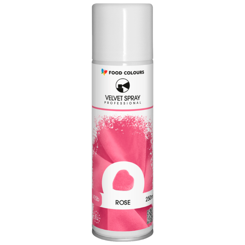 Velvet Spray Professional od Food Colours, to seria barwników spożywczych o strukturze zamszu przeznaczonych do dekorowania powierzchni wyrobów cukierniczych. Barwniki wytwarzane są na bazie tłuszczu kakaowego i umieszczane w pojemnikach pod ciśnieniem. Pozwalają na precyzyjne pokrywanie strukturalnymi kolorami powierzchni wyrobów cukierniczych. Zamsze spożywcze w wygodnej formie sprayu doskonale sprawdzą się do pokrywania zmrożonych powierzchni tortów, musów, monoporcji oraz półproduktów stosowanych do dekoracji. Forma barwników pozwala na precyzyjne pokrywanie dekorowanych wyrobów równomierną warstwą koloru.