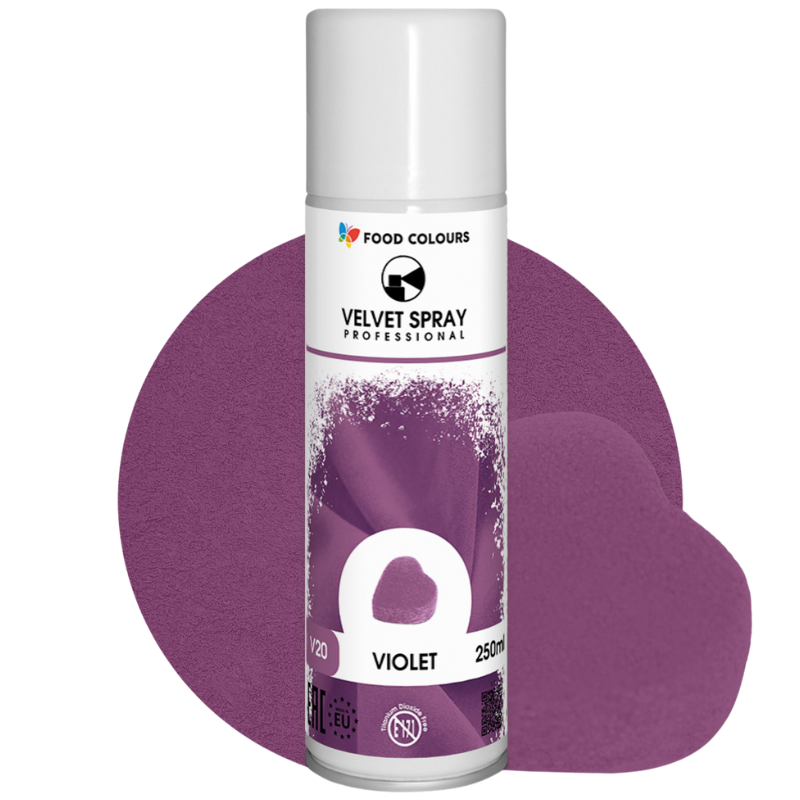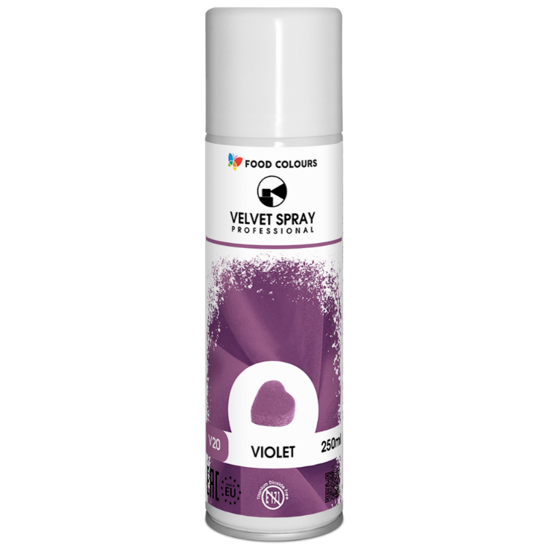 Velvet Spray Professional od Food Colours, to seria barwników spożywczych o strukturze zamszu przeznaczonych do dekorowania powierzchni wyrobów cukierniczych. Barwniki wytwarzane są na bazie tłuszczu kakaowego i umieszczane w pojemnikach pod ciśnieniem. Pozwalają na precyzyjne pokrywanie strukturalnymi kolorami powierzchni wyrobów cukierniczych. Zamsze spożywcze w wygodnej formie sprayu doskonale sprawdzą się do pokrywania zmrożonych powierzchni tortów, musów, monoporcji oraz półproduktów stosowanych do dekoracji. Forma barwników pozwala na precyzyjne pokrywanie dekorowanych wyrobów równomierną warstwą koloru.