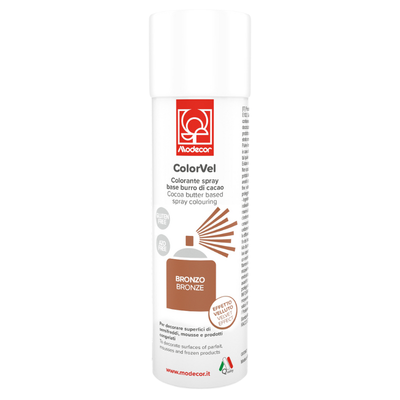 COLORVEL - to seria barwników o strukturze zamszu (na bazie masła kakaowego) umieszczonych w pojemnikach pod ciśnieniem. Pozwalają na precyzyjne pokrywanie strukturalnymi kolorami powierzchni wyrobów cukierniczych. Zamsze spożywcze w sprayu doskonale sprawdzą się podczas dekorowania zmrożonych powierzchni tortów, musów oraz półproduktów. Forma barwników pozwala na precyzyjne pokrywanie dekorowanych wyrobów równomierną warstwą koloru. Ponadto barwniki są proste w użyciu, należy jedynie pamiętać o ich dokładnym wstrząśnięciu przed nałożeniem oraz spryskiwaniu powierzchni z odpowiedniej odległości (minimum 20-25 cm). Barwniki są całkowicie bezpieczne do spożycia - należy jednak przestrzegać wytycznych co do ich dozowania.