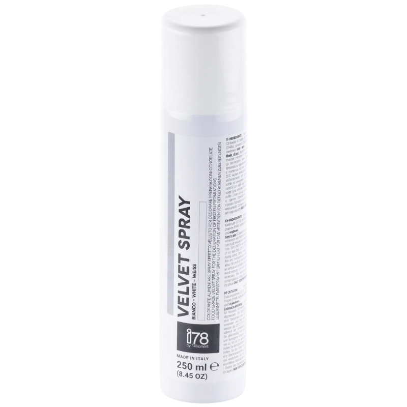 Velvet Spray I78 by Silikomart, to aksamitny spray spożywczy o strukturze zamszu przeznaczony do dekoracji powierzchni mrożonych deserów. Spray został opracowany na bazie tłuszczu kakaowego i przeznaczony jest przede wszystkim do stosowania przez profesjonalistów.