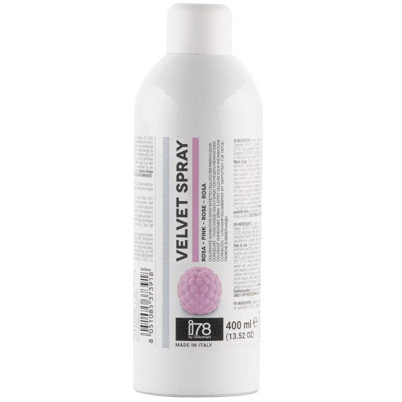 Velvet Spray I78 by Silikomart, to aksamitny spray spożywczy o strukturze zamszu przeznaczony do dekoracji powierzchni mrożonych deserów. Spray został opracowany na bazie tłuszczu kakaowego i przeznaczony jest przede wszystkim do stosowania przez profesjonalistów.