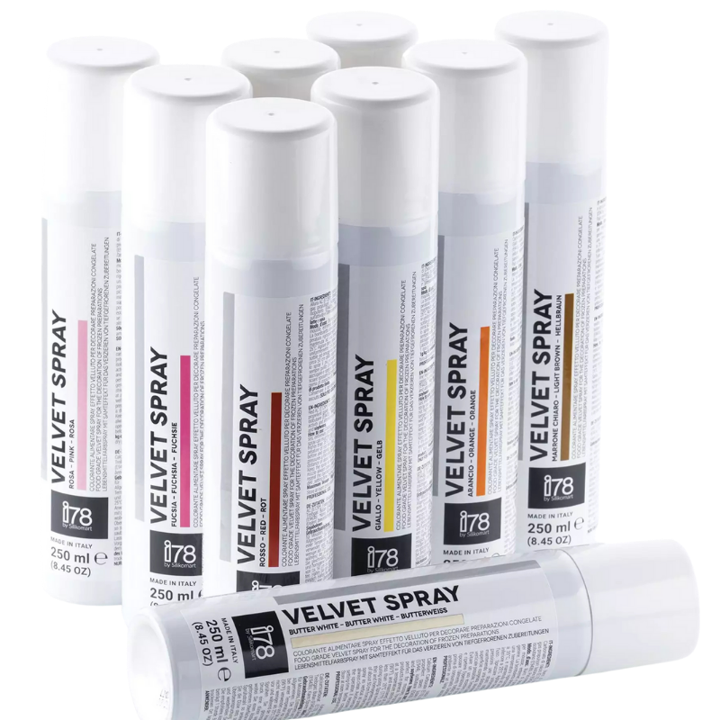 Velvet Spray I78 by Silikomart, to aksamitny spray spożywczy o strukturze zamszu przeznaczony do dekoracji powierzchni mrożonych deserów. Spray został opracowany na bazie tłuszczu kakaowego i przeznaczony jest przede wszystkim do stosowania przez profesjonalistów.