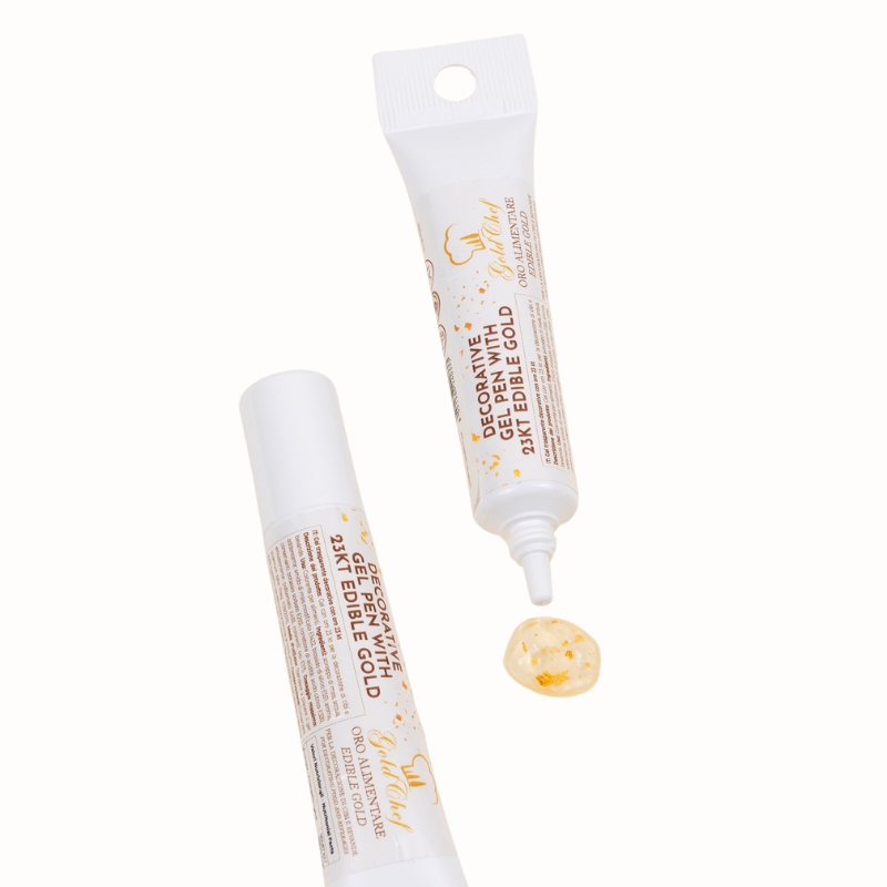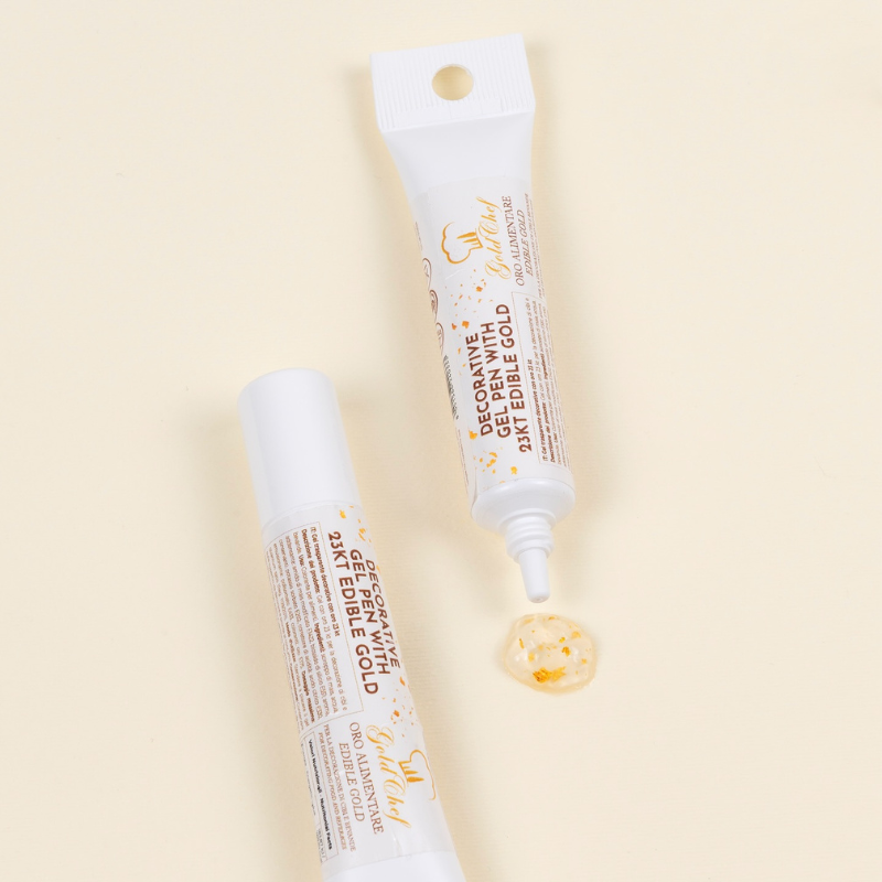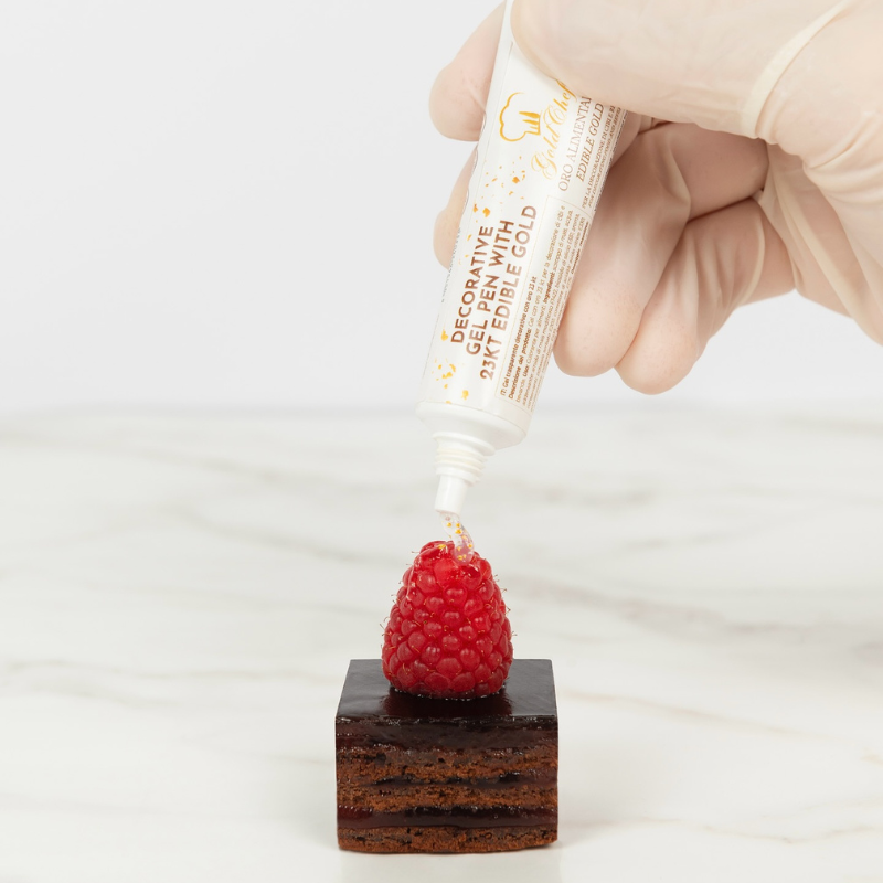 Żel dekoracyjny to wysokiej jakości produkt wytwarzany we Włoszech. Wykonany z użyciem 23-karatowego złota pochodzącego z odpowiedzialnych źródeł. Złoto jadalne to produkt obojętny biologicznie, nie posiada smaku, a jego struktura nie jest wyczuwalna dla podniebienia. Produkowane jest w fabryce Giusto Manetti Battiloro zlokalizowanej we Florencji. Idealnie nadaje się do dekoracji deserów i drobnych wypieków, dodając słodkim kreacjom elegancji i luksusu. Transparentny żel zawiera drobinki 23-karatowego złota, które dodają blasku i wyrafinowania. Dzięki precyzyjnej końcówce żel jest łatwy do nakładania. Sprawdzi się zarówno w profesjonalnej pracowni, jak i w zaciszu domowej kuchni. Gotowy do użycia żel pozwoli w łatwy sposób uzyskać zaskakujący efekt. Złoto jadalne to bezpieczny dodatek spożywczy zgodny ze wszystkimi przepisami prawa i przepisami sanitarnymi. Wytwarzane z kontrolowanych, certyfikowanych i odpowiedzialnych surowców - cały proces podlega 10 odrębnym etapom kontroli i przebiega w pełnej zgodności z Rozporządzeniami Unii Europejskiej 1333/2008 i 231/2012. Złoto produkowane jest bez zastosowania miedzi - co gwarantuje doskonałą jakość produktu.