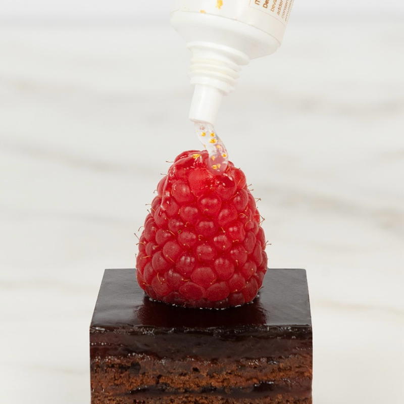 Transparenty żel dekoracyjny z drobinkami 23-karatowego złota jadalnego. Wygodna tubka z precyzyjnym dozownikiem. Gotowy do użycia żel dekoracyjny z błyszczącymi kawałkami złota. Przeznaczony do dekoracji spożywczych. Prosty sposób na efektowną prezentację przystawek, potraw, deserów i wypieków.